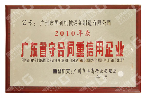 2011年4月,继连续三年被评为“广州市守合同重信用企业”之后,国研机械再获殊荣,被评为2010年度“广东省守合同重信用企业”。